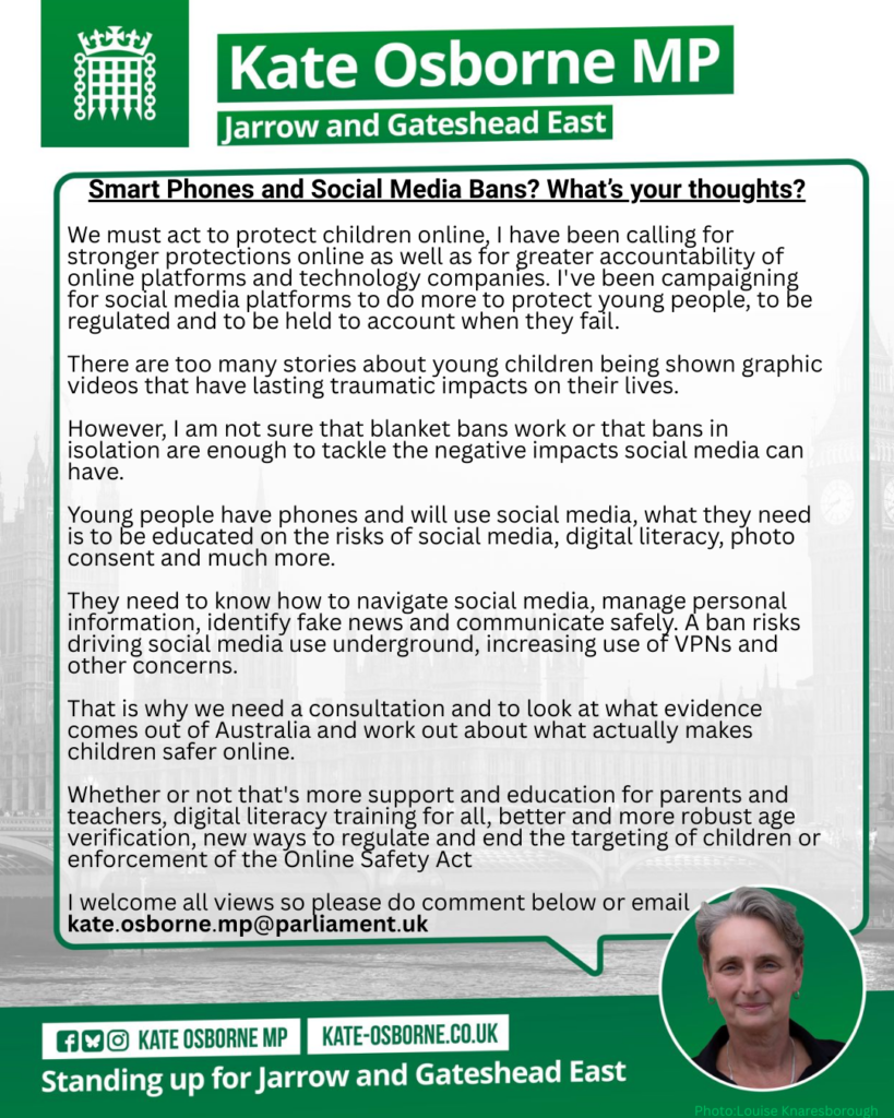 I have been inundated with emails from constituents about banning social media for under 16’s. This week the Government set out its plans for a consultation and I welcome that